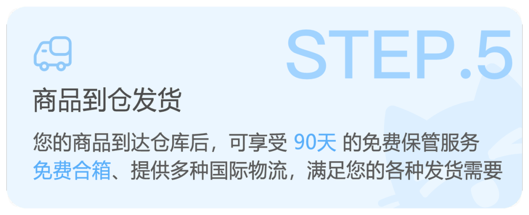 当您的商品到达仓库后,可享受 90天 的免费保管服务、免费合箱、提供多种国际物流,满足您的各种发货需要。