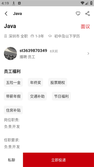 6、点击立即投递即可,也可以点击私聊提前了解公司与岗位的情况。