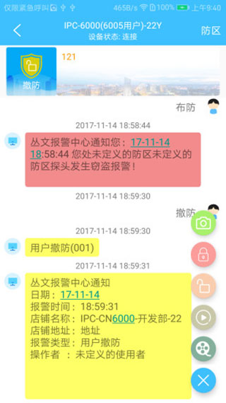对于前端电子的各种状态和信息,警云中心平台可以采用独特的聊天方式推送相应消息到各个密码授权通过的警云APP,包括实时消息、历史消息等,方便用户查看及查询。相应信息包括:布撤防信息、报警信息、视频及图片信息、报警中心的各种通知信息等。