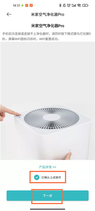 3、按下模块键与灯光键5秒,屏幕wifi图标闪烁时,再点击下一步,连接净化器后输入wifi和密码即可连接。