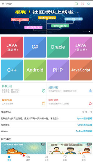软件特色包括读书模块、视频课程和互动社区。读书模块提供电子书资源,视频课程涵盖体系化学习和实战项目,帮助用户系统提升。社区则让用户可以分享问题、下载资料并互动交流。
