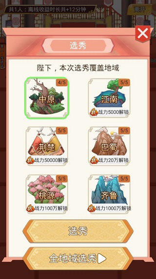 在游戏里选秀可在不同的地域里做选择,如江南美女、异域美女,桃源丽人肯定颜值很赞,为了抱得美人归,朕决心平叛乱,灭藩国,将国土扩大收纳,用战力,啊呸!~用魅力征服天下美人!