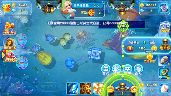 多样渔场,挑战升级:火山、深渊、珊瑚礁...各种特色渔场等待您的征服,每一片海域都有意想不到的惊喜。