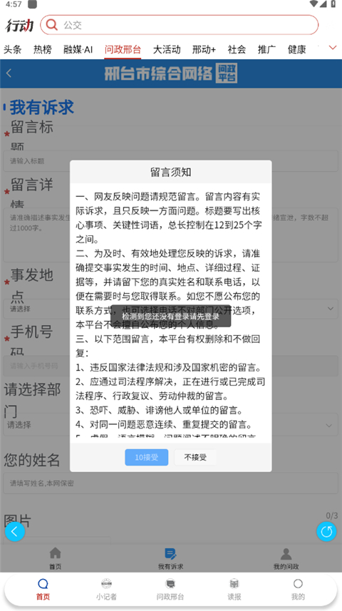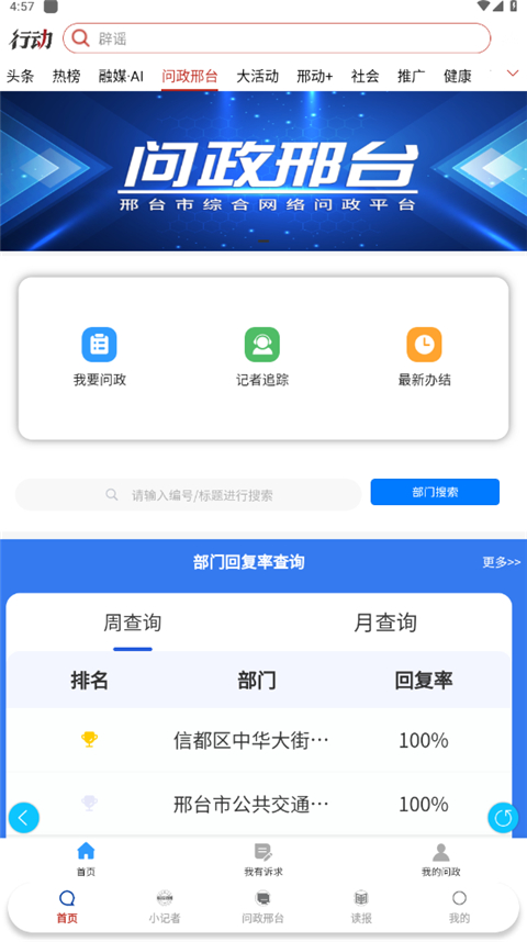 行动新闻app提供新闻、政务、服务板块功能,邢台本地市民可以在这里快捷的了解实时最新新闻咨询内容,以及邢台日报、邢州报两大读报。如想反馈本地问题情况还可以在问政邢台中进行问政反馈,政府人员会进行核查确认并进行处理,在相应工作日内回复市民!