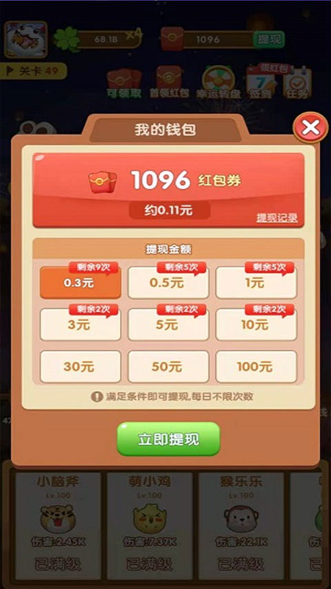 1、闯关,每过一关奖励一次汇报,通关的关卡越多,赚的红包也就越多。如果关卡内出现首领,击败后可额外领取首领红包,这个奖励的红包券会更多点。