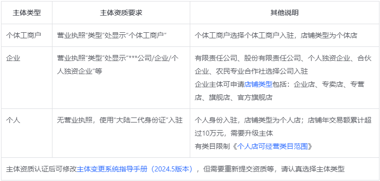 根据您所具备的资质,或者经营需求,申请相应的开店主体(个体、企业、个人):