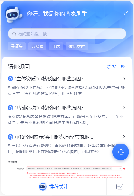 抖店入驻过程中,遇到任何问题均可在页面右下方的商家助手,点击展开后,可看到常见问题的答案,也可以进行搜索查询,若仍解决不了您的问题,可点击联系商服(右下角“耳麦”图标)进行人工咨询。