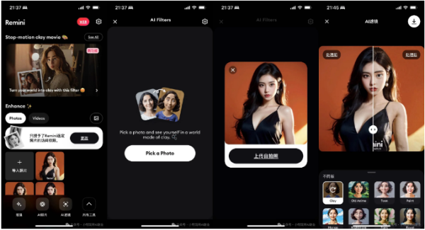 打开“Remini”,在首页中选择“Turn your world into clay with this filter”,然后就会跳到新画面,我们点击“Pick a photo”,从我们的相册中选择一张照片,点击上传,然后等待大概一分钟,让应用帮我们生成粘土滤镜风格的照片。