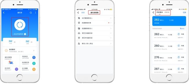 ③点击「号码找回」可见历史版本和回收站,可恢复至之前备份的历史版本或还原误删的号码。