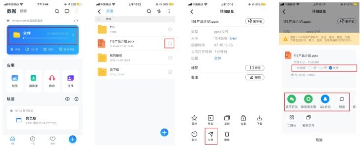 ①「大众分享」:所有115注册用户均支持文件分享,用户可以将文件分享给不同平台的好友(微信/QQ好友)。