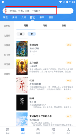 1、进入笔趣阁典藏版App,在书城中通过搜索栏或是榜单进行搜索;