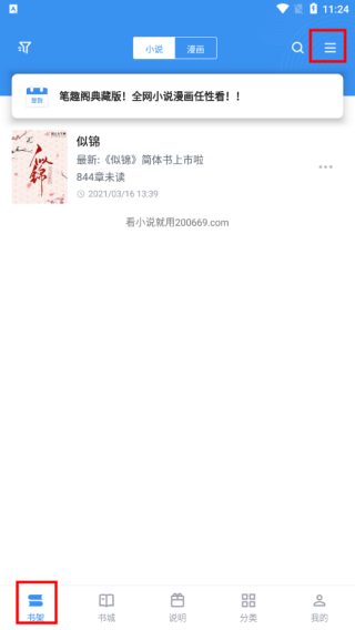 1、进入笔趣阁典藏版App的书架板块,点击右上角的三条杠;