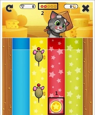 游戏中屏幕下方会不停的有老鼠跑出,颜色不同的老鼠其速度和行径都不一样,玩家需要在老鼠快到达终点时点击相对应的跑道消灭老鼠,跑道上还会出现游戏币(如图示1),只需点击敲打相对应的跑道就可以拾取游戏币,每敲打一次,游戏币前进一步。游戏越往后老鼠前进的速度会越来越快,在屏幕上方有五个点(如图示2),当玩家不小心让一只老鼠通过,这里的点就会亮起来一个,当五个点全部亮起,游戏就结束了。