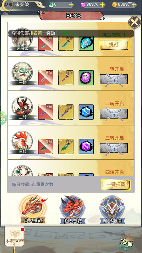 4、战力变强后就可以参与BOSS挑战了,包括单人、多人、矿野迷津副本,挑战后还可以直接扫荡获得丰富的奖励。