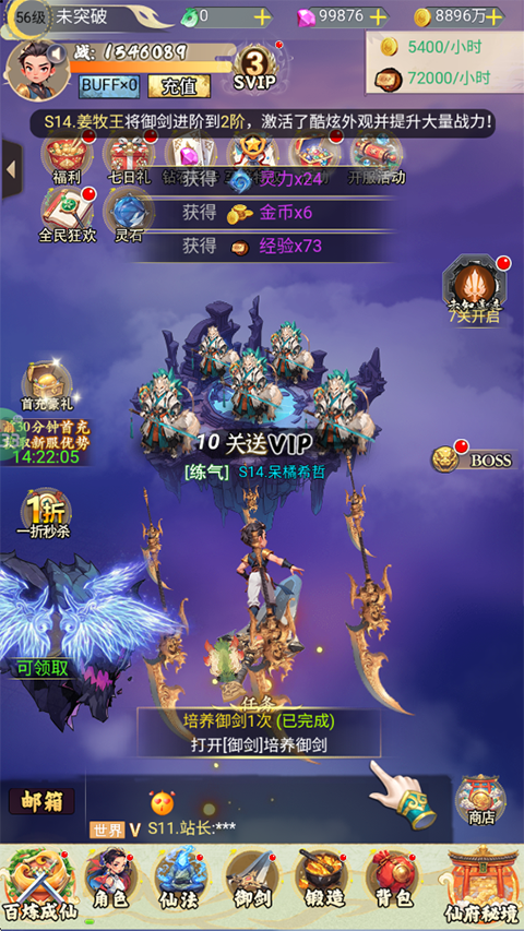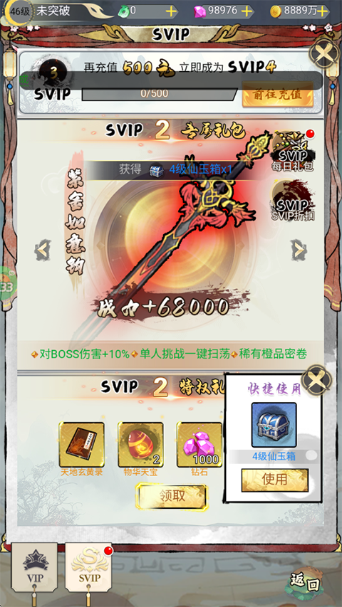 3、完成指定的闯关任务后玩家可以直接领取VIP10,并且可以获得丰富的材料,下面我们可以对御剑和仙宠物进行培养。