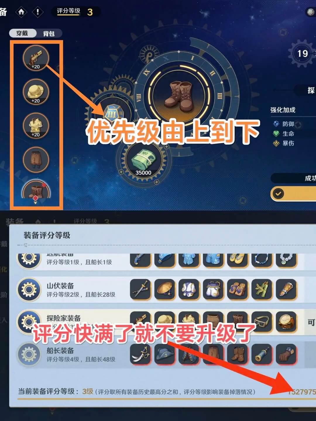 我们要注意的是这个东西,装备评价,其实就是把你最高级的装备穿在身上就可以提升这个分数。分数高了就会掉落更高级的装备。如果你现在身上穿的就是你现在能穿的最高等级的装备了,那就给你的装备升级,装备的优先级其实就是由上到下,武器最优先,然后是帽子,衣服,依次下推。如果你现在身上穿的是3级,但是你的评级已经到达了4级,或者快到了4级,那就不要升级了。