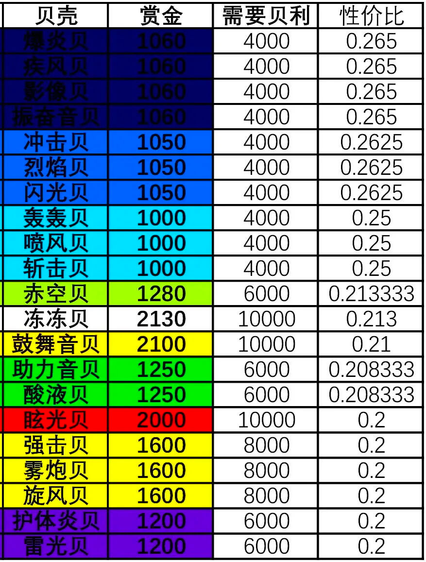 空岛贝之前我说过有些空岛贝不用激活,但是其实有些冷门的空岛贝搭配某些特殊的角色还是挺好用的,所以还是能激活就都激活吧,然后升级看这个表,由上而下的优先级,赤空贝以下的只去升级自己常用就好,不常用的激活了就放在那儿就好,非必要不升级!