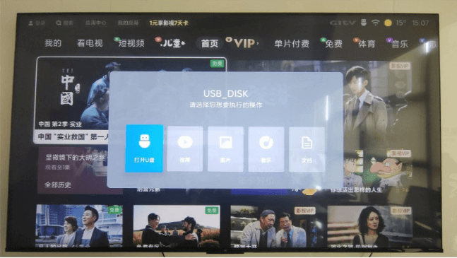 2、将下载好的小飞电视安装包的U盘插入到电视的USB接口上,会提示检测到新的USB设备打开