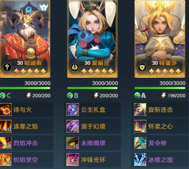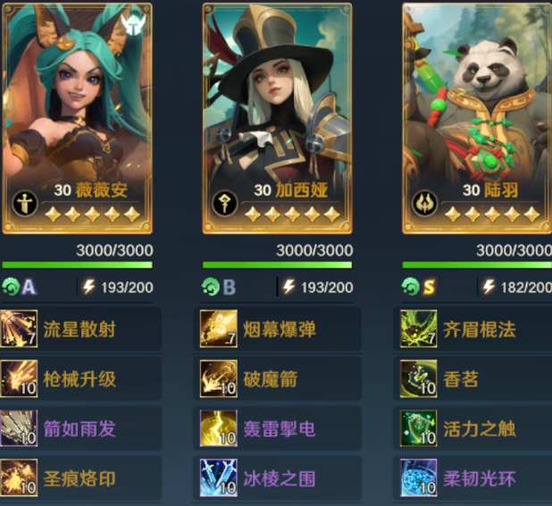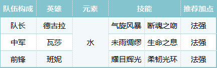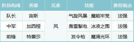 风系顶配队,主要利用宙斯高额的群体输出能力打伤害,加西亚负责提供负面效果、削弱敌方属性,特蕾莎提供增伤减伤等辅助效果,可以作为开荒备选,33级时可以利用此阵容开9级地。