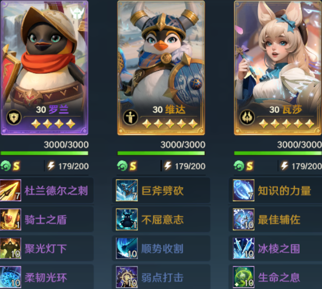 这是一套比较经典的铁三角开荒阵容,其中,维达作为主C,有着比较强力的AOE伤害能力,且被动【不屈意志】可以在高血量时增加伤害,低血量时获得减伤,生存能力非常优秀。罗兰为队伍提供护盾和保护,且其普攻可以造成禁用效果,使对方无法放出技能,为队伍创造良好的输出环境。瓦莎作为前期十分强力的辅助英雄,既可以提供增伤,还拥有不俗的治疗能力,搭配【生命之息】可以为队伍提供良好的回复,确保续航能力,适用性极其广泛。