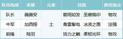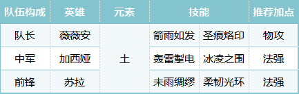 土系顶配队,利用薇薇安的稳定伤害+加西亚的辅助能力,可以应对大部分的开荒战斗场景,陆羽负责提供净化和增伤,确保队伍的输出环境。