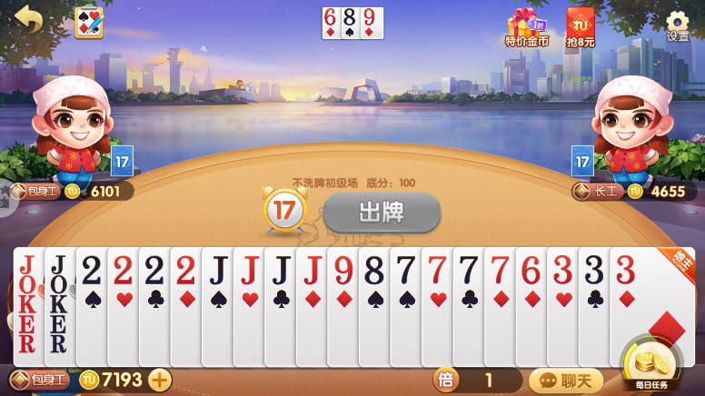 每局游戏使用一副54张的扑克牌,每位玩家分得17张,剩余3张为底牌,在地主确定之前,玩家无法查看底牌内容。
