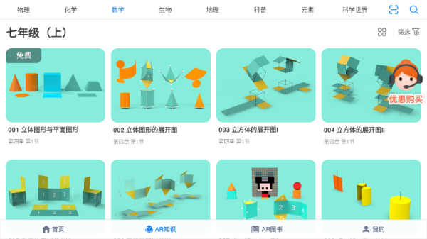 生动科学AR是一款基于AR技术打造的知识学习平台软件,为用户提供初、高中数学、物理、化学、地理、生物、元素、科普七个板块的重要点知识,不同于枯燥的平面知识教学,生动科学通过AR技术将课堂变得生动有趣,每个知识点都包含3D原理演示、语音讲解、操作互动、考试评测等多元化立体内容,将枯燥的知识生动化、抽象原理形象化,将远古恐龙、航天等内容带到用户眼前,生动形象的加深学生的记忆力,帮助激发学生的探知欲。