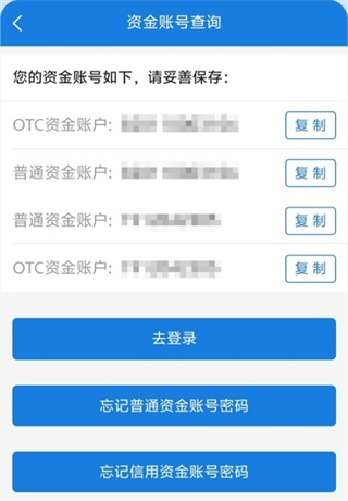 步骤2:显示资金账号查询结果,查询结果支持一键复制。如您记得密码,可跳转进行登录操作;如忘记密码,也可跳转进入密码重置等操作。