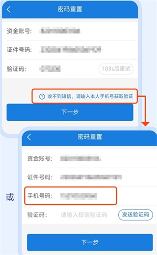 步骤1:进入【交易及资金密码重置】功能页输入资金账号、证件号码,开户手机号接收验证码,填写完整后点击【下一步】。如无法通过开户手机号接收短信验证码可点击【收不到短信,请输入本人手机获取验证】,使用本人身份证办理的其他手机号接收验证码。