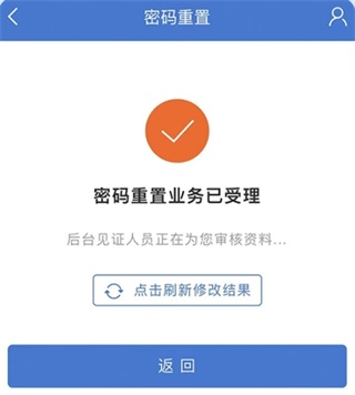 步骤3:根据系统提示,上传本人真实有效身份证照片,进行信息确认、视频身份验证设置新密码等后续环节后,页面提示密码重置业务已受理,待后台见证人员审核通过后生效。密码重置成功将发送短信通知,请留意查收。