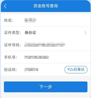 步骤1:进入【资金账号找回】功能页,输入真实姓名、身份证号、开户手机号,接收验证码填写完整后点击【下一步】