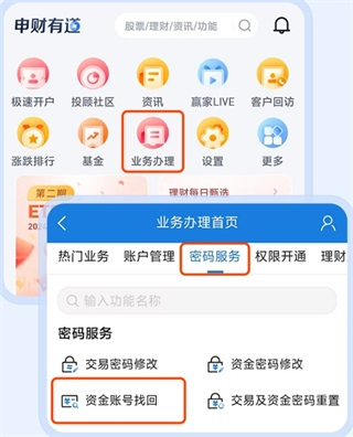 路径:申财有道APP首页十宫格【业务办理】密码服务】-【资金账号找回】