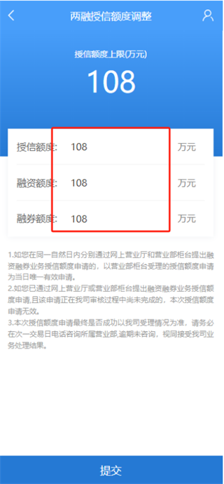 1、授信额度不能超过系统显示的授信额度上限,融资额度和融券额度均不能超过授信额度。