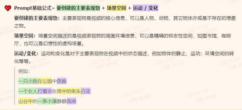 Prompt基础公式适用于对于视频没有明确的镜头呈现需求,或者期待使用AI视频激发创作灵感的朋友,自由的Prompt可以获得更具想象力的画面。