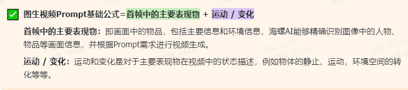 图生视频使用的图片作为视频的首帧出现,限定了视频的主体物形象和基本画面美学风格,因此相比文生视频Prompt,图生视频Prompt可以适当地减少信息量。
