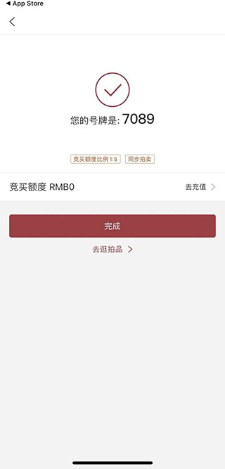 3、通过以上的一系列操作你就可以获得一个拍卖号码牌,但是此时你还没有办法直接参与竞拍,你可以点击充值按钮,充值一定的额度。目前参加中国嘉德的网络竞拍需要最低缴纳5000元保证金。通过微信或者支付宝直接付款就可以了。如果竞拍失败,这个费用将会原路返回,如果竞拍成功那么你需要补齐尾款。
