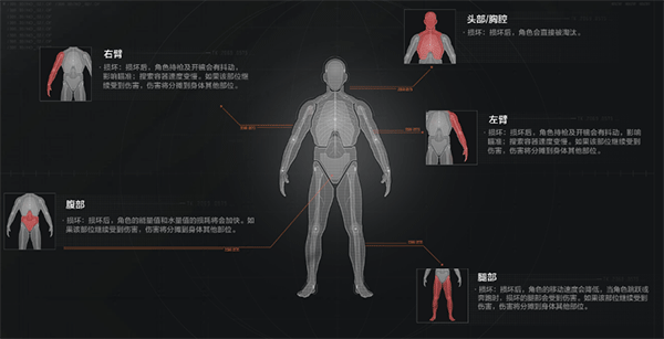 游戏中健康系统与其它射击游戏有很大区别,根据受伤部位、伤势的不同,会有不同的表现。除了头部之外,其它部位如果损坏后继续受到伤害,那么伤害将会分摊到身体其它部位。在暗区内或者暗区外都可以对角色进行治疗,角色不会自动恢复健康状态。