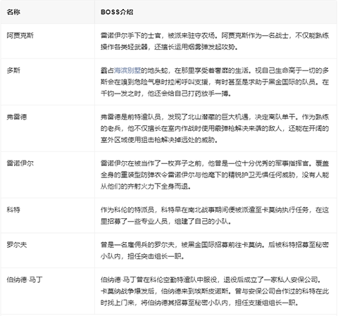 弗雷德;弗雷德作为熟练的老兵,不仅擅长在室内作战时使用霰弹枪解决来袭的敌人,还能在开阔的室外区域使用狙击枪解决掉远处的威胁。(可能出现地点:北山酒店、污水处理厂)