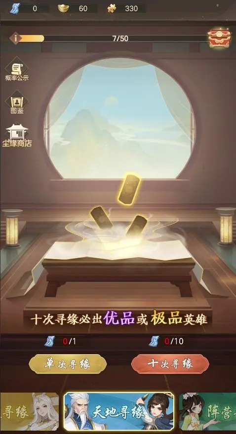 游戏中的“寻缘”包含了多种类型,如最基础的“天地寻缘”、只会抽到选定阵营的“阵营寻缘”和能抽取天庭与洪荒两种高级阵营英雄的“限定寻缘”。