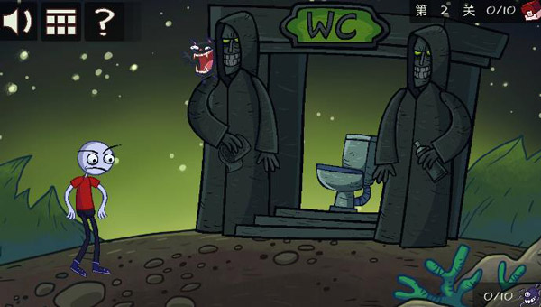 第二关:首先点击屏幕右侧的恶魔,喷雾一次以清除中间的气体障碍,然后点击厕所并坐下。