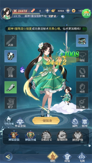 4、给角色上装备、神装套装、神装合成、升级技能这些都可以提升角色战力。