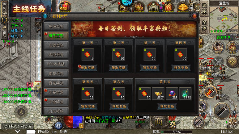 2、在游戏开始时,你将获得首充奖励和每日签到奖励。务必将这些福利用于提升自己的战力,获取元宝和稀有材料。此外,击杀怪物和挑战BOSS都会掉落大量资源,这些都能帮助你更好地提升装备和技能。