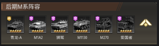 以M系为主作为阵容组建,配合M1A2的腐蚀效果,狮鹫可以打出极限伤害,爱国者给全队提供护盾保护的同时,可以联手M270打出爆炸性伤害,M1130则提供快速出手大招和超强的阵容治疗