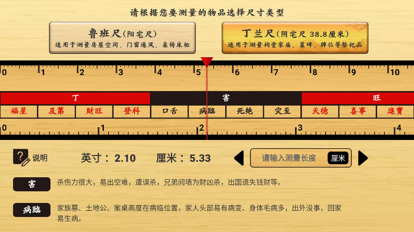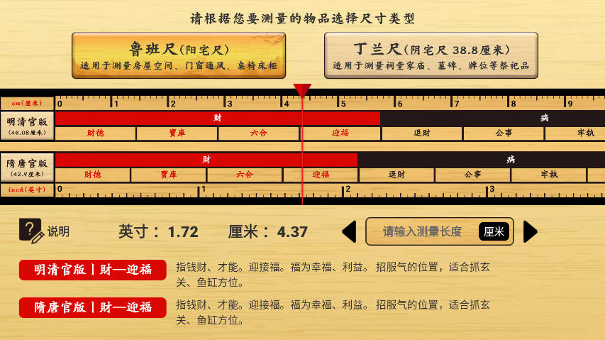 2、尺子选择:可自由切换“鲁班尺”与“丁兰尺”,鲁班尺又称“文公尺”,用于房屋宅邸、器具物品的尺寸测量,丁兰尺多用于家庙祠堂的尺寸测量;