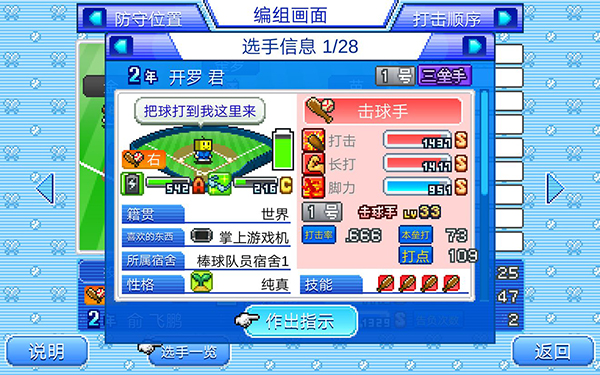 1年11,12月,继续刷E级F级球队,目前球队评价C,11个队员打击基本是C,长打基本是B,打击率石高破四成,其余都是3到4之间,还有主力投手连1都不到,浑水摸鱼。。。