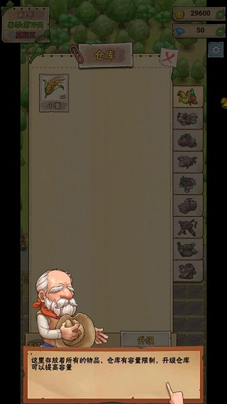 不同作物的成熟时期不同,时间越长的作物,收益越可观。期间收获的作物将会自动存放在仓库内,不过仓库具有容量限制,升级仓库可以提高容量。