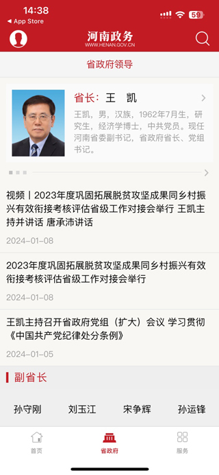 河南政务app是河南省人民政府公布政务信息的新媒体平台,由河南省政府办公厅举行,大河网络传媒集团负责运营管理。目前,此软件已开通新闻、河南、领导活动、企业、地域、民生保障、法律法规、政策、宣传、图片新闻等多个渠道。该频道初次权威解读河南省委重要决策部署和关键法律法规,及其河南省政府领导同志的重要会议、调研和访问活动。除上述功能外,河南政务app还可以帮助用户办理网络查询、交费、申领证件等相关事务。