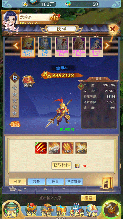 2、角色选项卡包含你的游戏装备、坐骑、仙翼、神兵、领域以及图鉴;