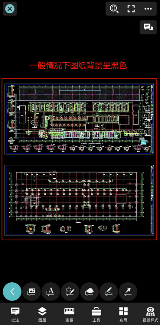 1、通常情况下,我们用浩辰CAD看图王APP打开图纸时默认为黑色背景,观察起来相当清晰。但是,在户外工作时,如果遇到阳光强烈的情况,就会难以辨认CAD图纸的细节。为此,我们需要采取一些措施来解决这个问题。