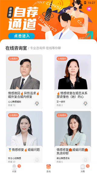 2、咨询界面可以自荐成为咨询师,也能找到自己想要的咨询师解决问题。